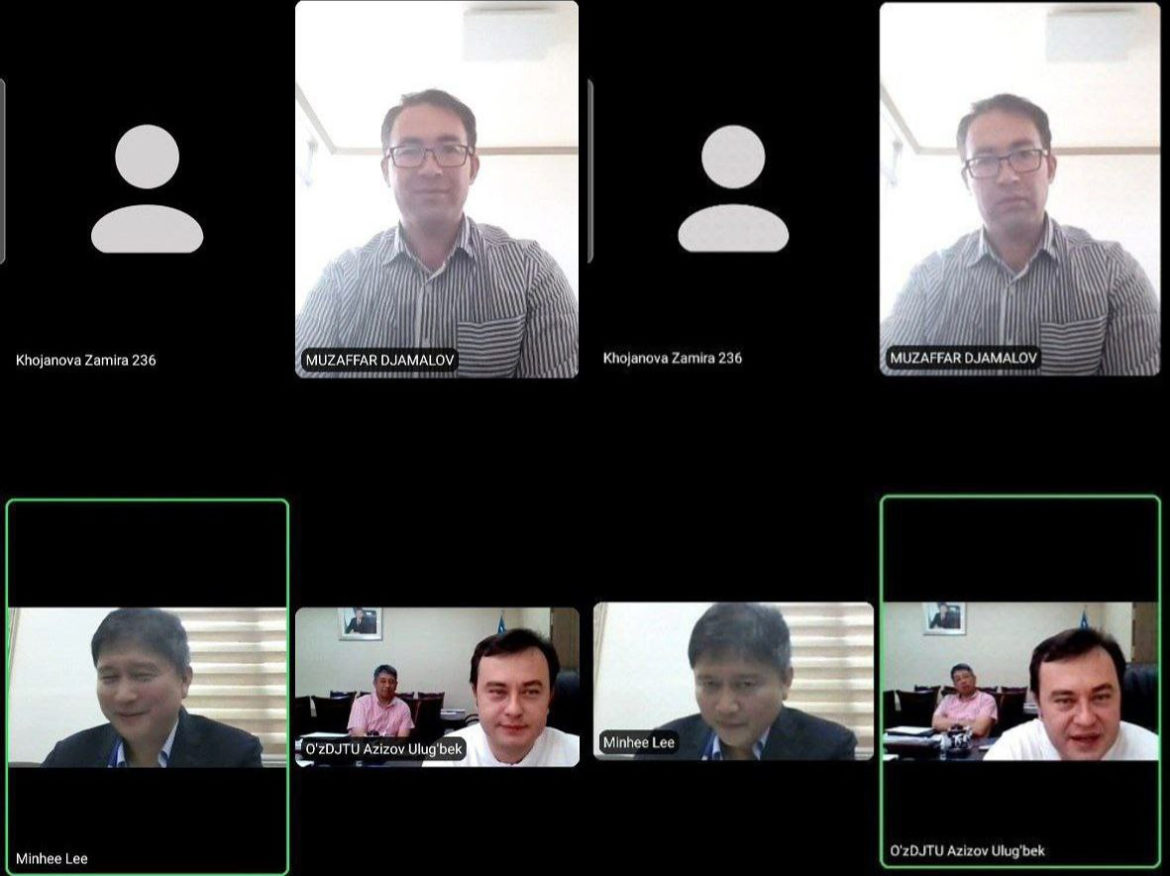 Bugun, 16 Iyun kuni O’zDJTU rahbariyati va Joongbu Universiteti rasmiy vakillari o’rtasida onlayn Zoom uchrashuvi bo’lib o’tdi. Uchrashuvda Joongbu Universitetining o’quv ishlari bo’yicha prorektori Jung Yull Lee, xalqaro hamkorlik bo’yicha prorektor Choi Youn Mo va xalqaro aloqalar bo’limi boshlig’i Lee Min Hee, shuningdek O’zDJTU rektori U. Azizov va xalqaro hamkorlik bo’yicha prorektor A. Abidjanov ishtirok etdilar. Asosiy maqsad Koreys tili bilan barobarida ikki diplomli komputer dasturlashtirish o’quv programmasini yo’lga qo’yish. Suhbat davomida loyiha tasdiqlandi va ma’lumot berish, targ’ibot qilish va amalga oshirish bosqichlariga o’tish kelishildi. Loyihaning bajarilishi keyingi o’quv yilining boshiga kutilyabti.